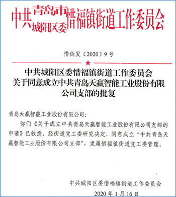 2020年初,經(jīng)上級黨組織工作委員會審核決定,青島天贏智能工業(yè)股份有限公司正式獲批成立黨支部,并由中共城陽區(qū)惜福鎮(zhèn)街道工作委員會頒發(fā)了《關(guān)于同意成立中共青島天贏智能工業(yè)股份有限公司支部的批復(fù)》。