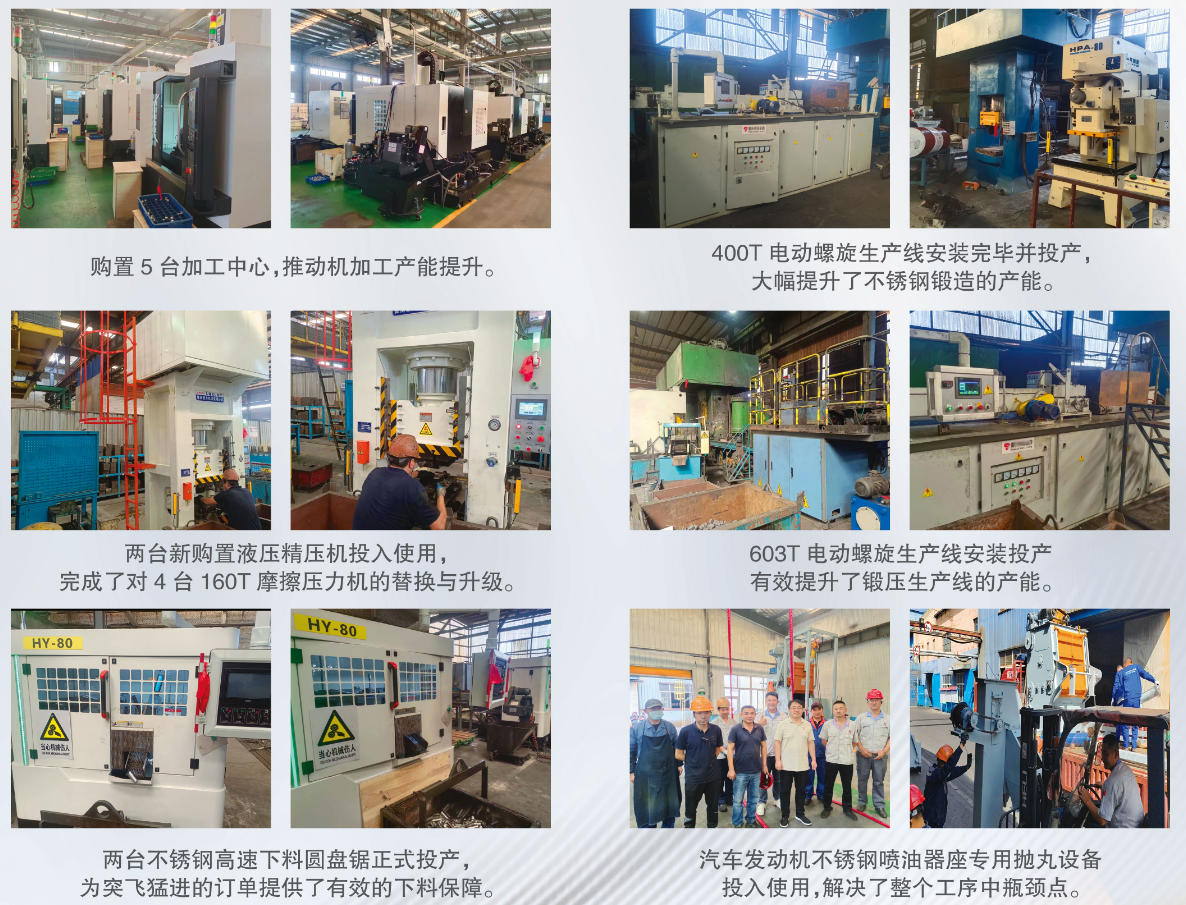 隨著新項(xiàng)目的落地,天贏工業(yè)持續(xù)對(duì)設(shè)備進(jìn)行更新?lián)Q代,先后購(gòu)置了多臺(tái)加工中心、400T電動(dòng)螺旋生產(chǎn)線、603T電動(dòng)螺旋生產(chǎn)線、液壓精壓機(jī)、不銹鋼高速下料圓盤鋸、不鋼噴油器座專用拋丸設(shè)備等設(shè)備,為天贏工業(yè)2024年的高速發(fā)展,打下了硬件設(shè)備保障的堅(jiān)實(shí)基礎(chǔ)。
